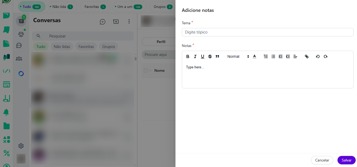 Você quer lembrar de algo sobre algum cliente ou lead? Este campo adiciona notas e tarefas em contatos individuais. Adicione quantos comentários quiser.